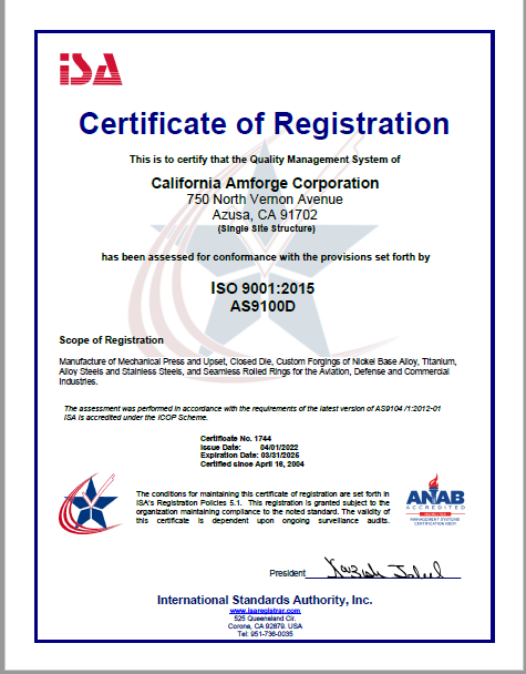 California Amforge is certified to the highest standards for aerospace and defense. We are also certified to produce components for all major aerospace OEMs. We deliver forged components that meet the highest quality standards—on time, every time.